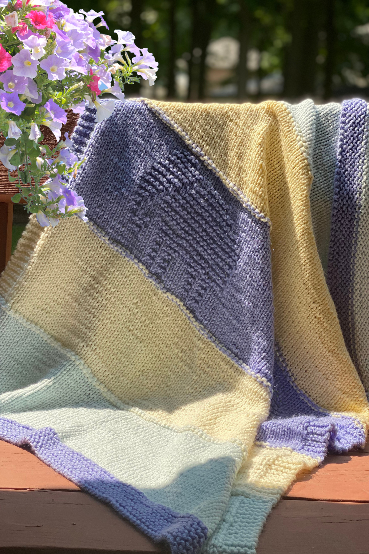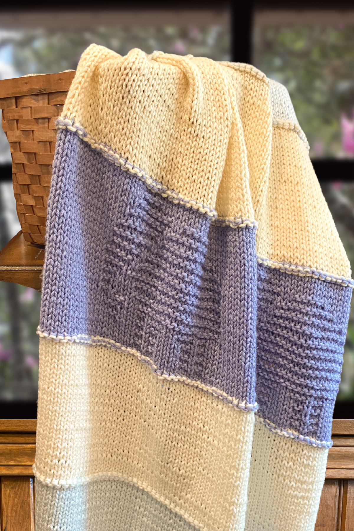 Project shown with 700 yards of Hobby Lobby’s Aran Weight I Love This yarn in Periwinkle, Lemon Ice and Arctic Ice