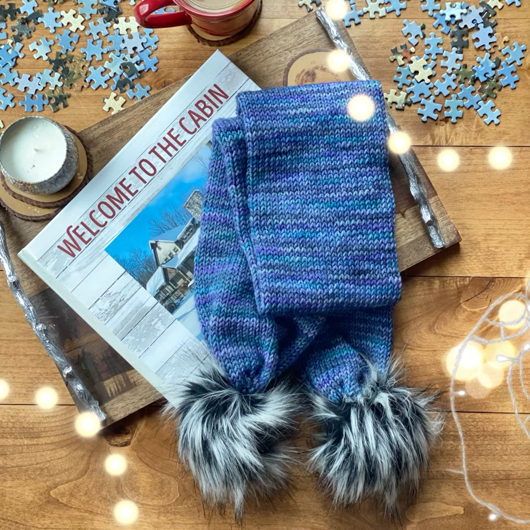 A free pompom scarf knitting pattern that is so easy to knit that if you can knit, purl and K2tog, this will be easy for you!