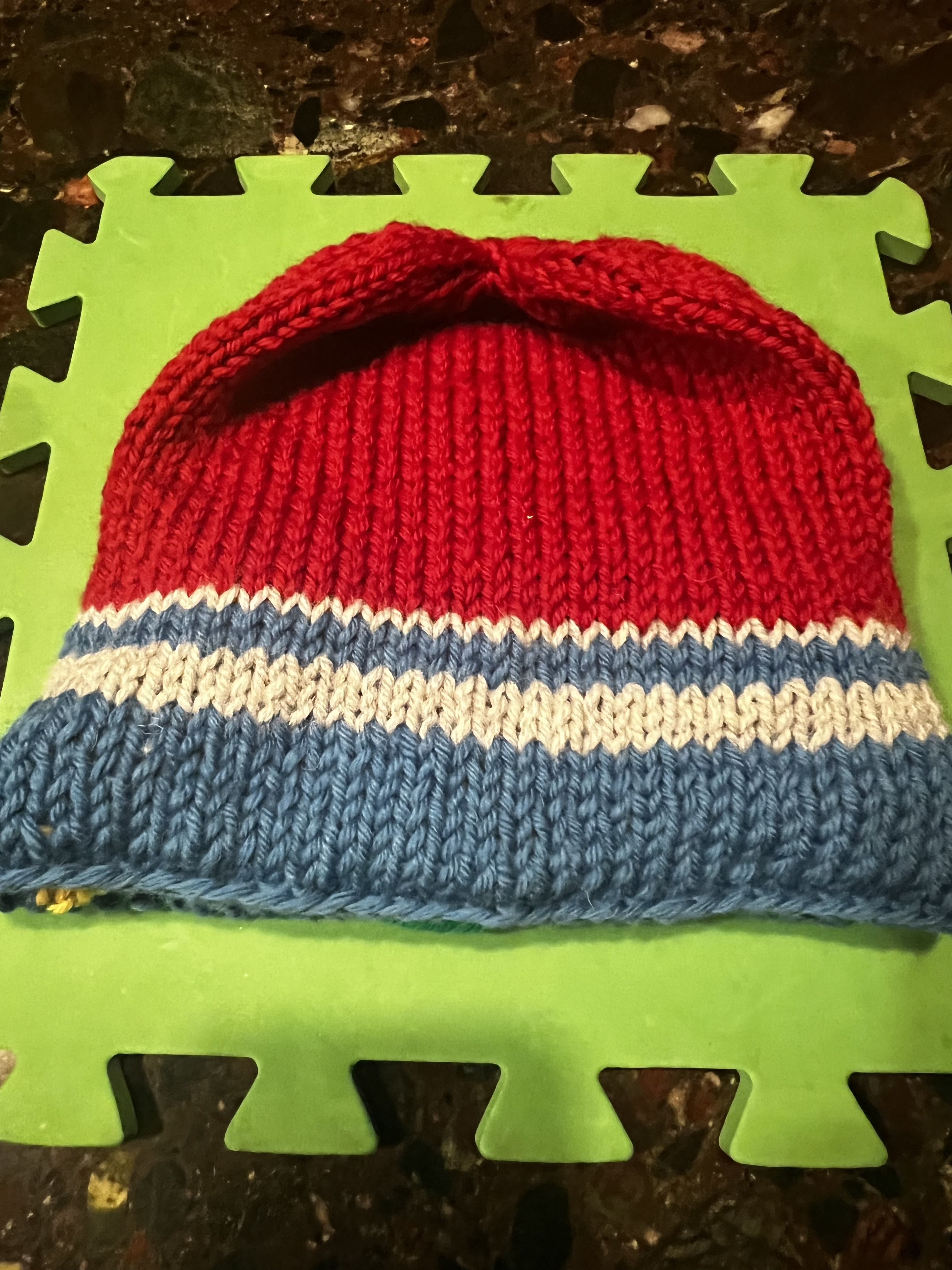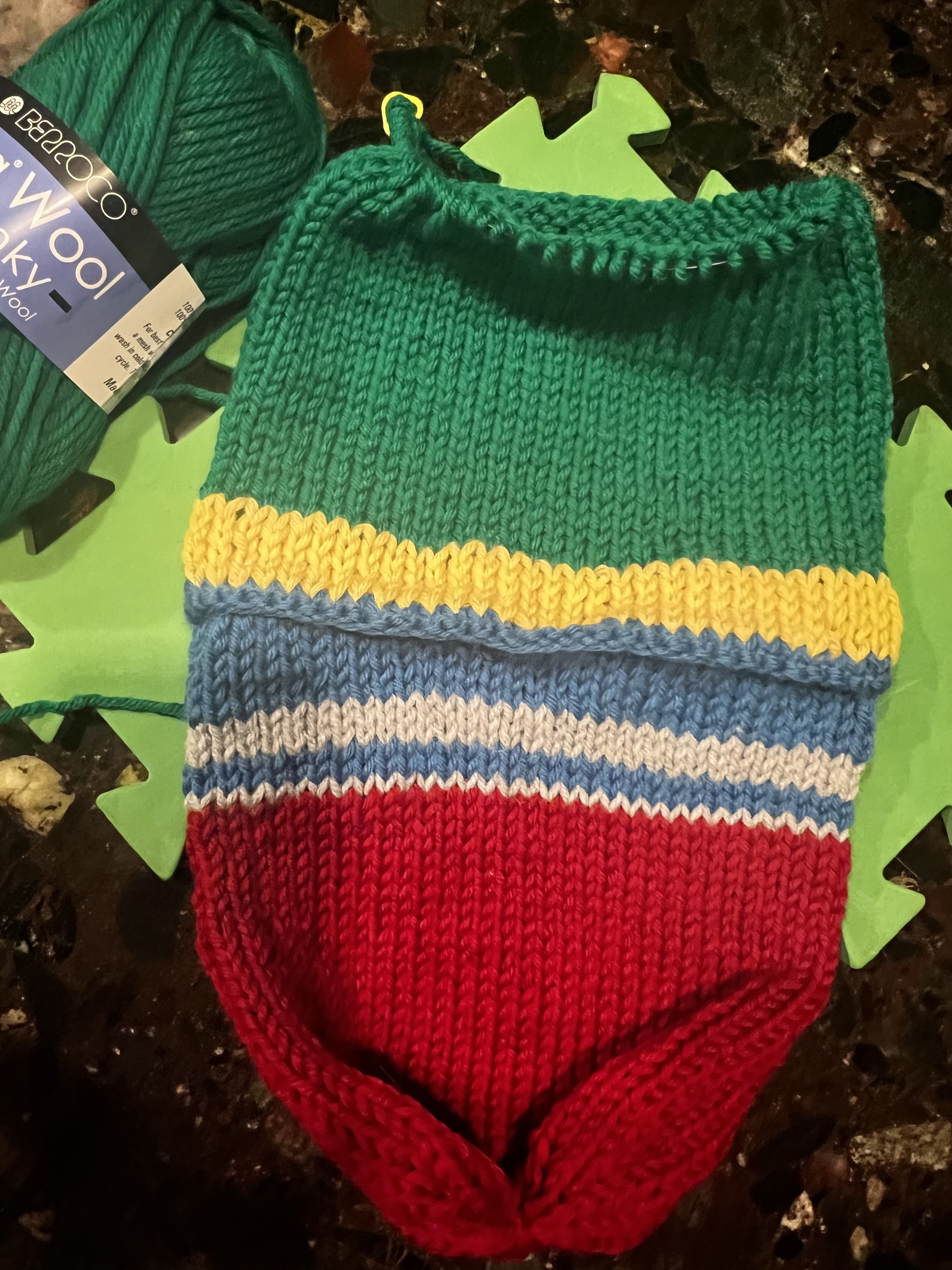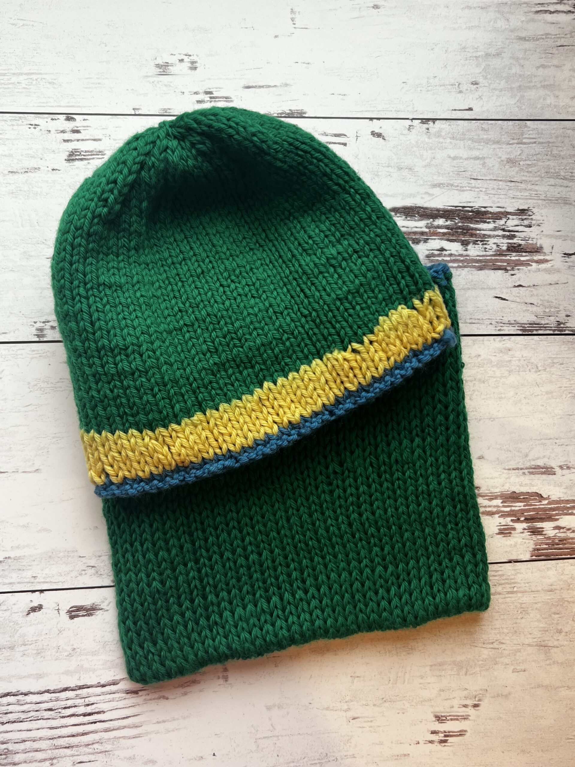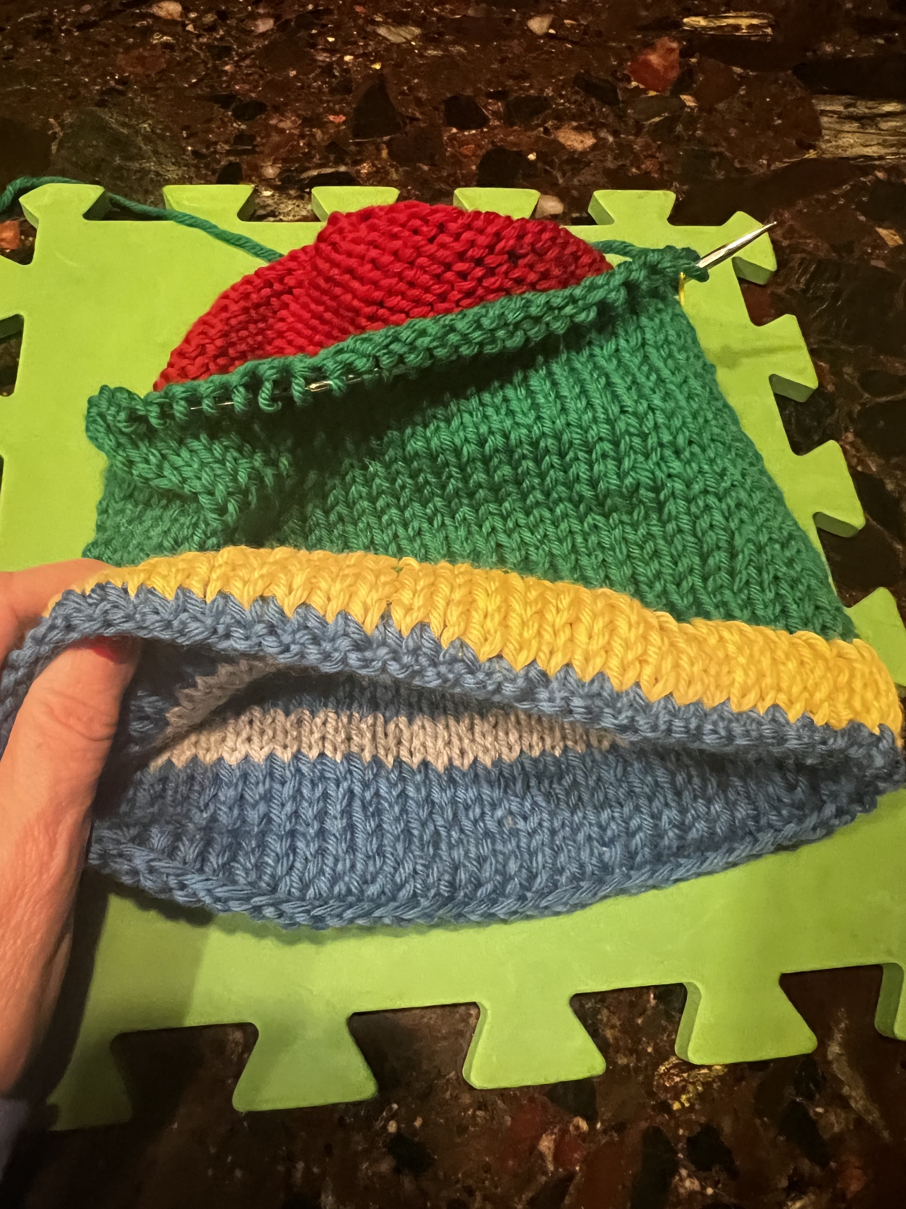Put the yellow stitches of the inside hat on the needles and begin to knit with green.