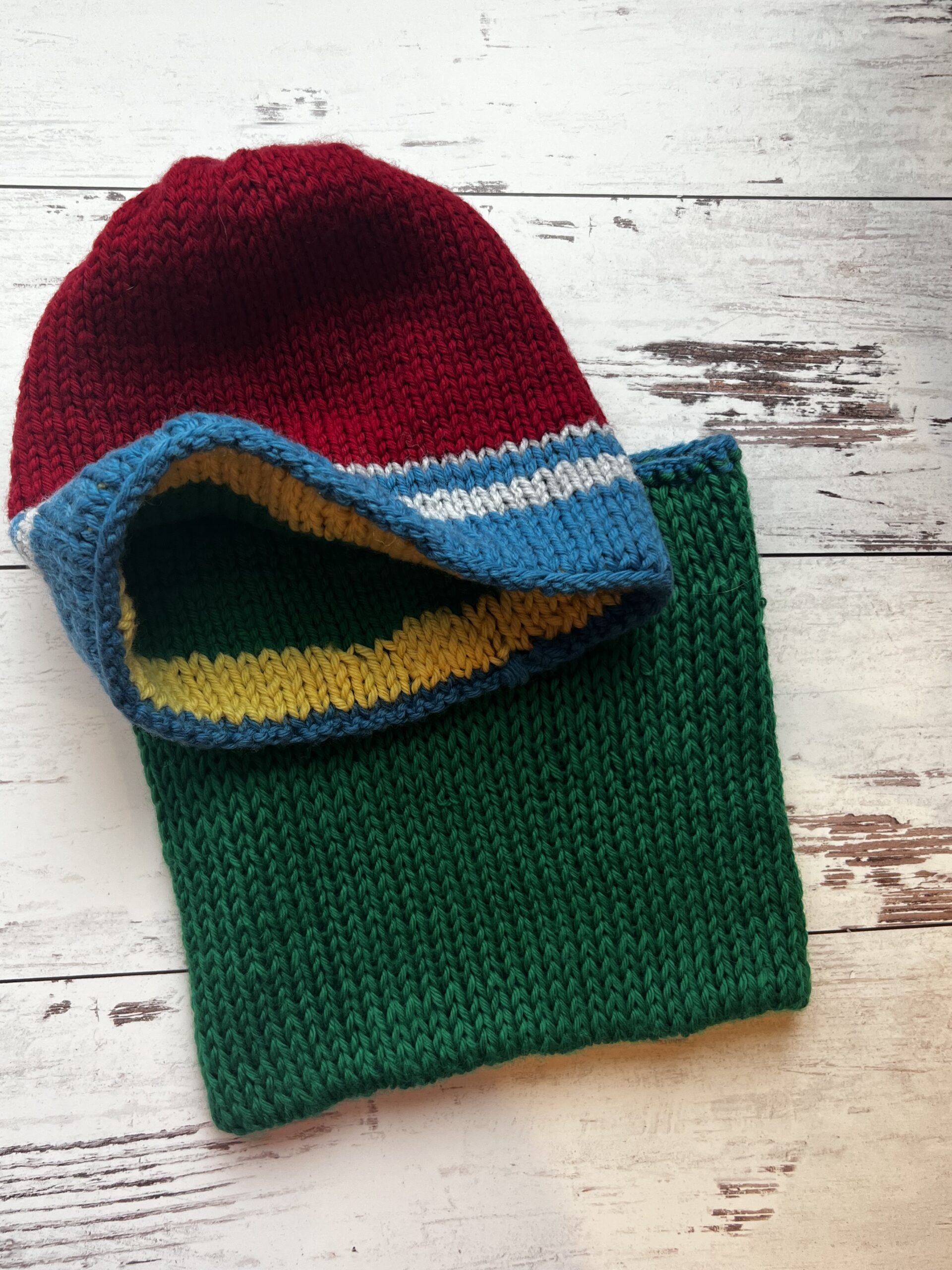 red and blue hat with green neckwarmer