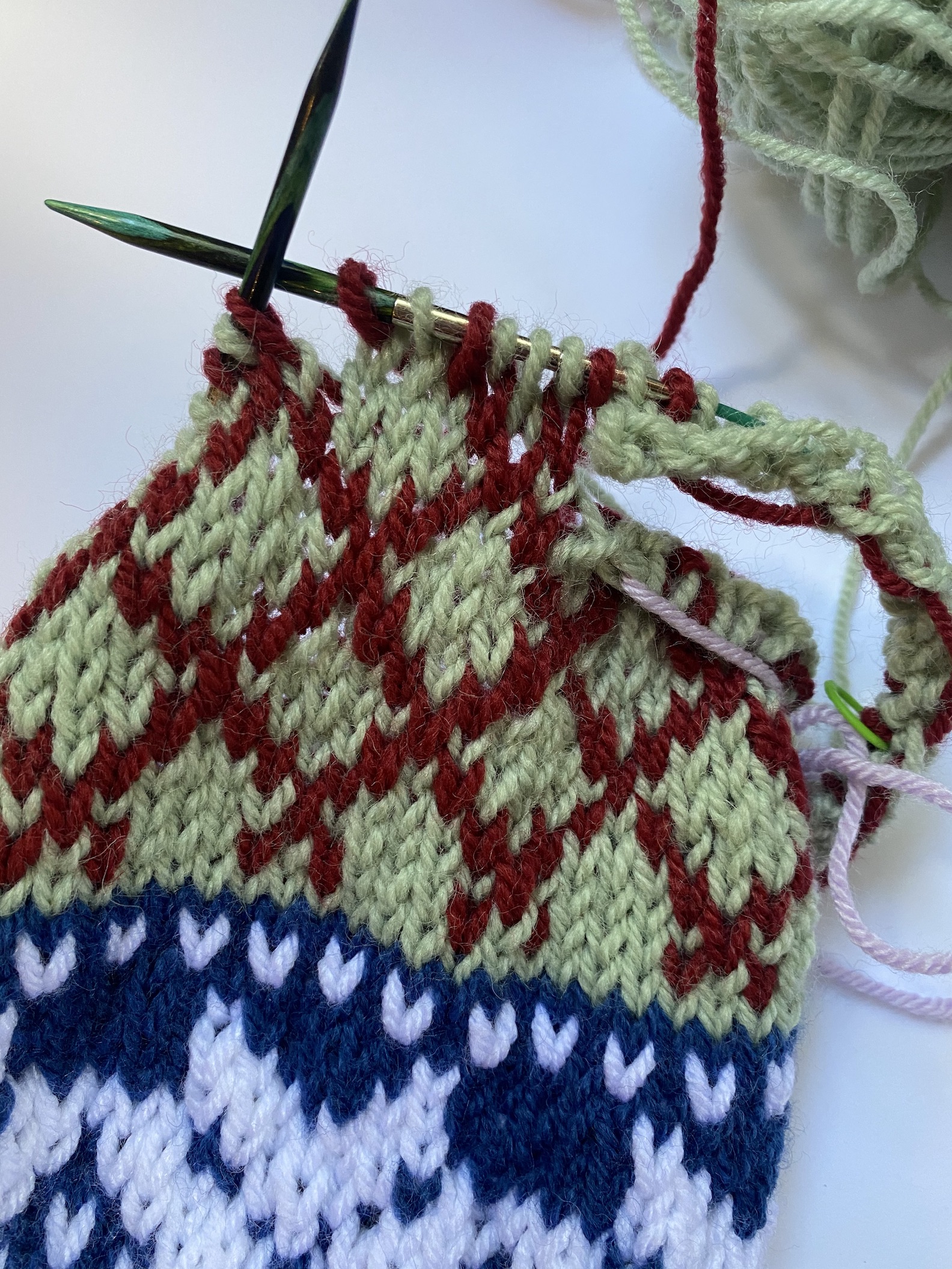 The all around chart is from the Cascade pattern. Again, to separate the sections, I transitioned to the next chart by knitting 1 of each color, then a solid row.