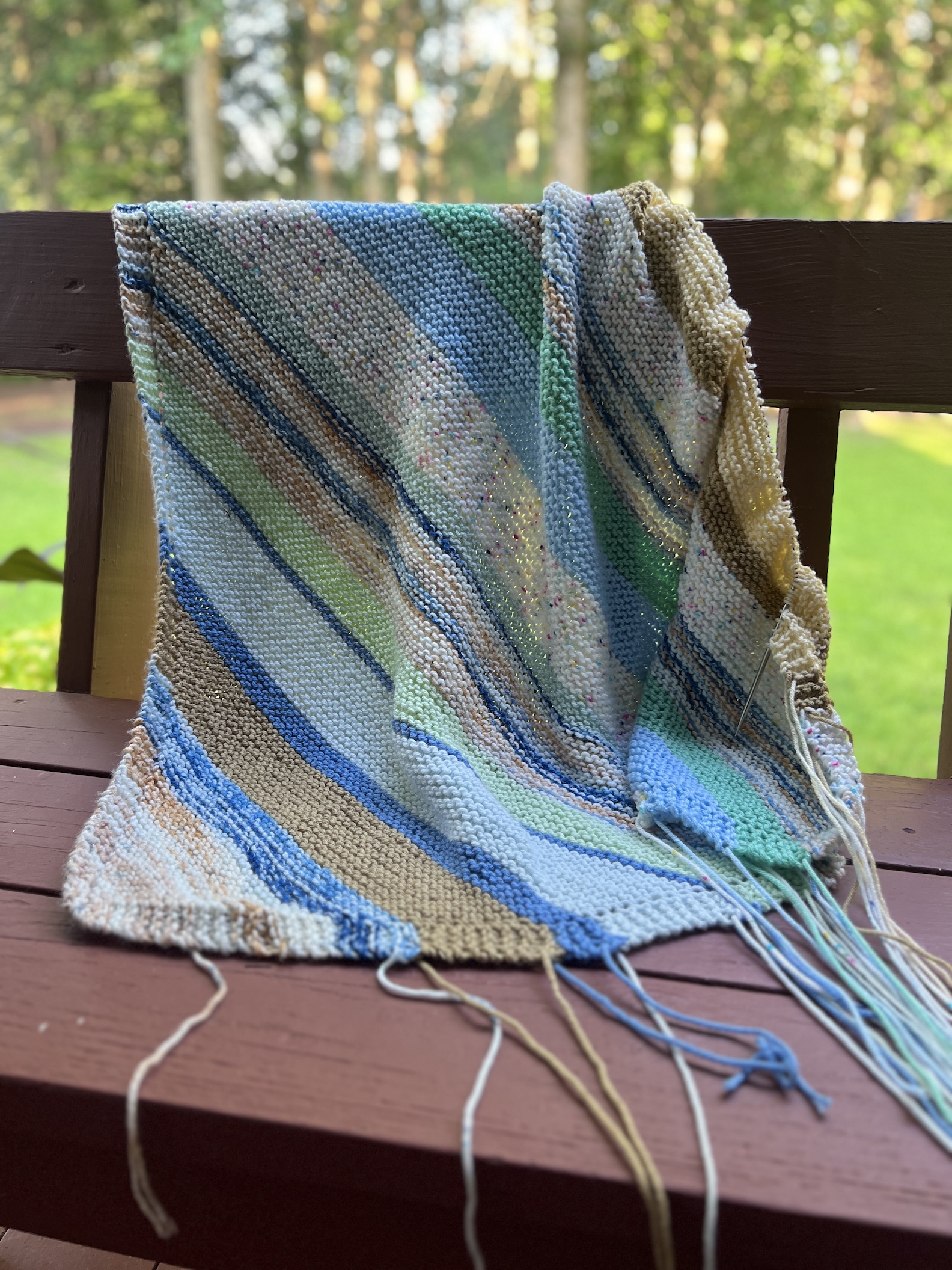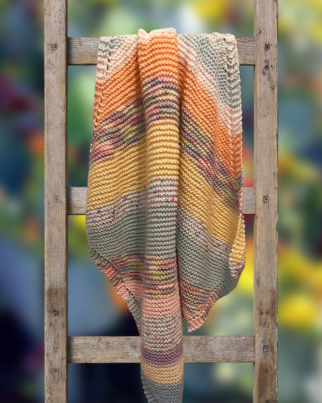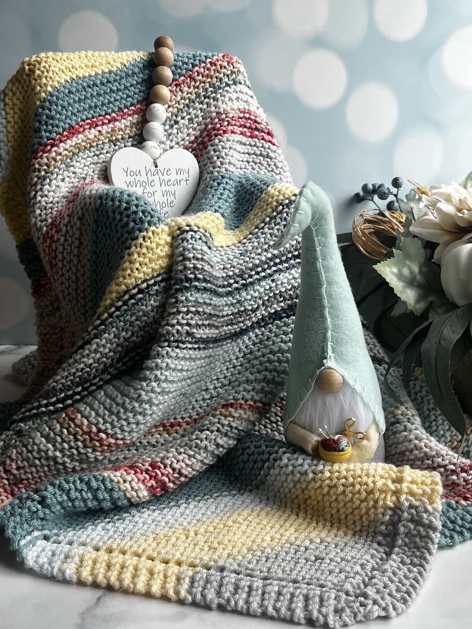 Project is shown with Hobby Lobby’s Worsted/Aran Weight I Love This yarn in lots of scrappy colors left over from blankets that I have been knitting over the past several months.