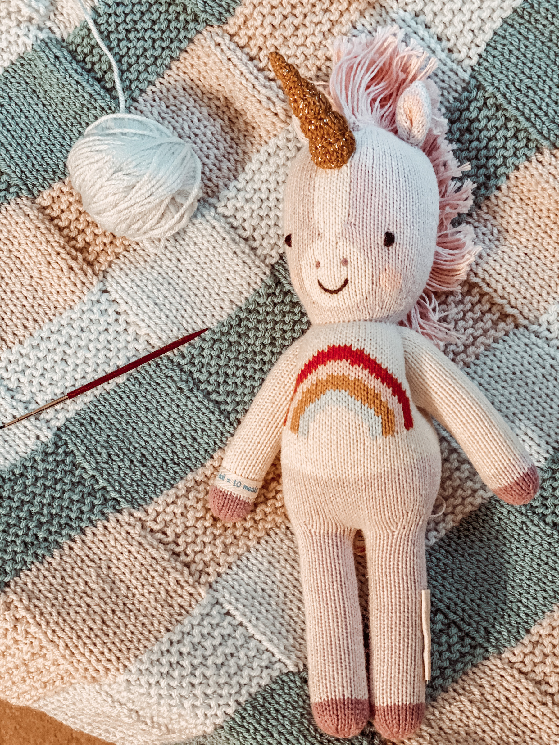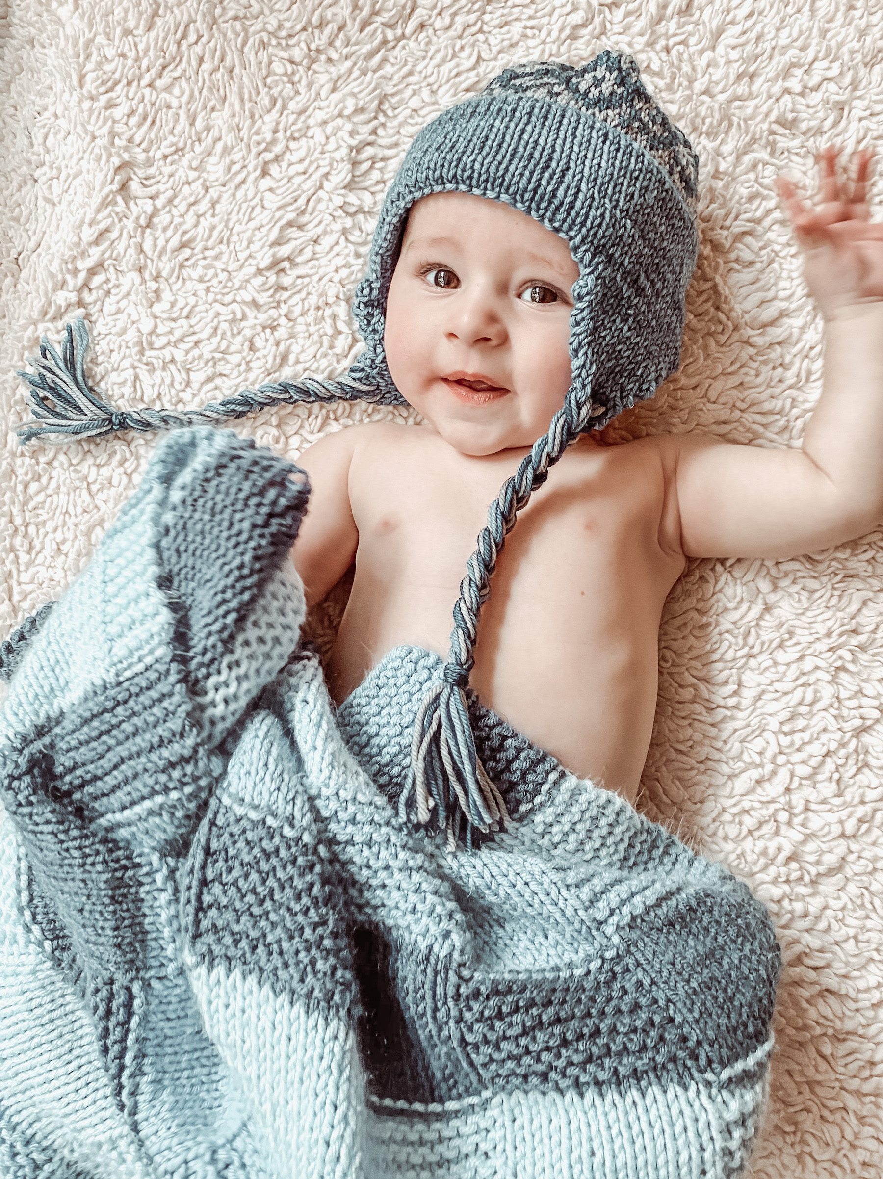 Using a size 8 needle the blanket begins with a garter stitch border. After the border, the color is cut and a new color joined in.