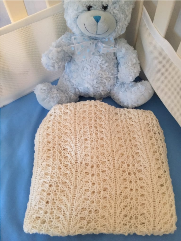 I knit this baptismal baby blanket pattern for each of my grandchildren’s baptisms. It is lacy and pretty but works for both boys and girls. I should know since I have 5 grandsons and 1 granddaughter! I have knit this in aqua, cream and white.