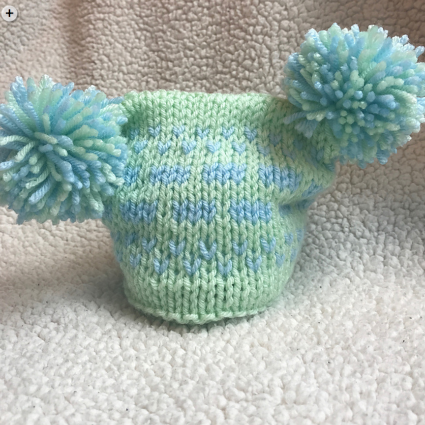 Row 10 and 11: Knit 3 blue, knit 1 green, repeat