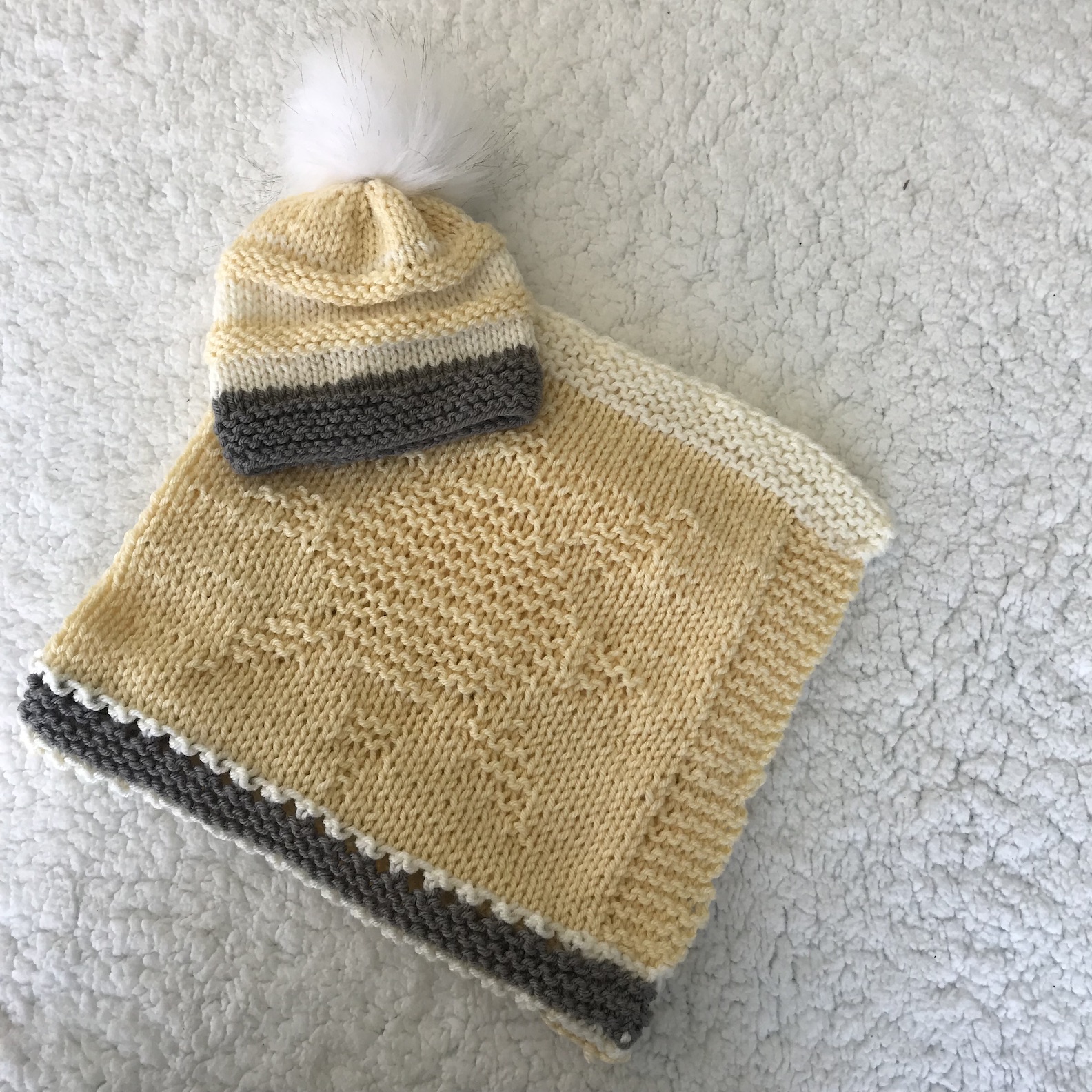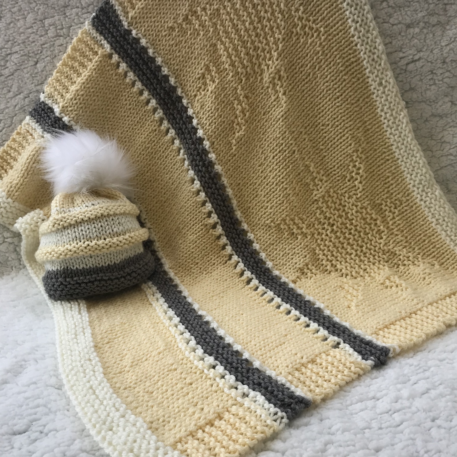 baby blanket knitting pattern for a yellow blanket with suns knit and purled and a pompom hat that is yellow and grey with a white pompom