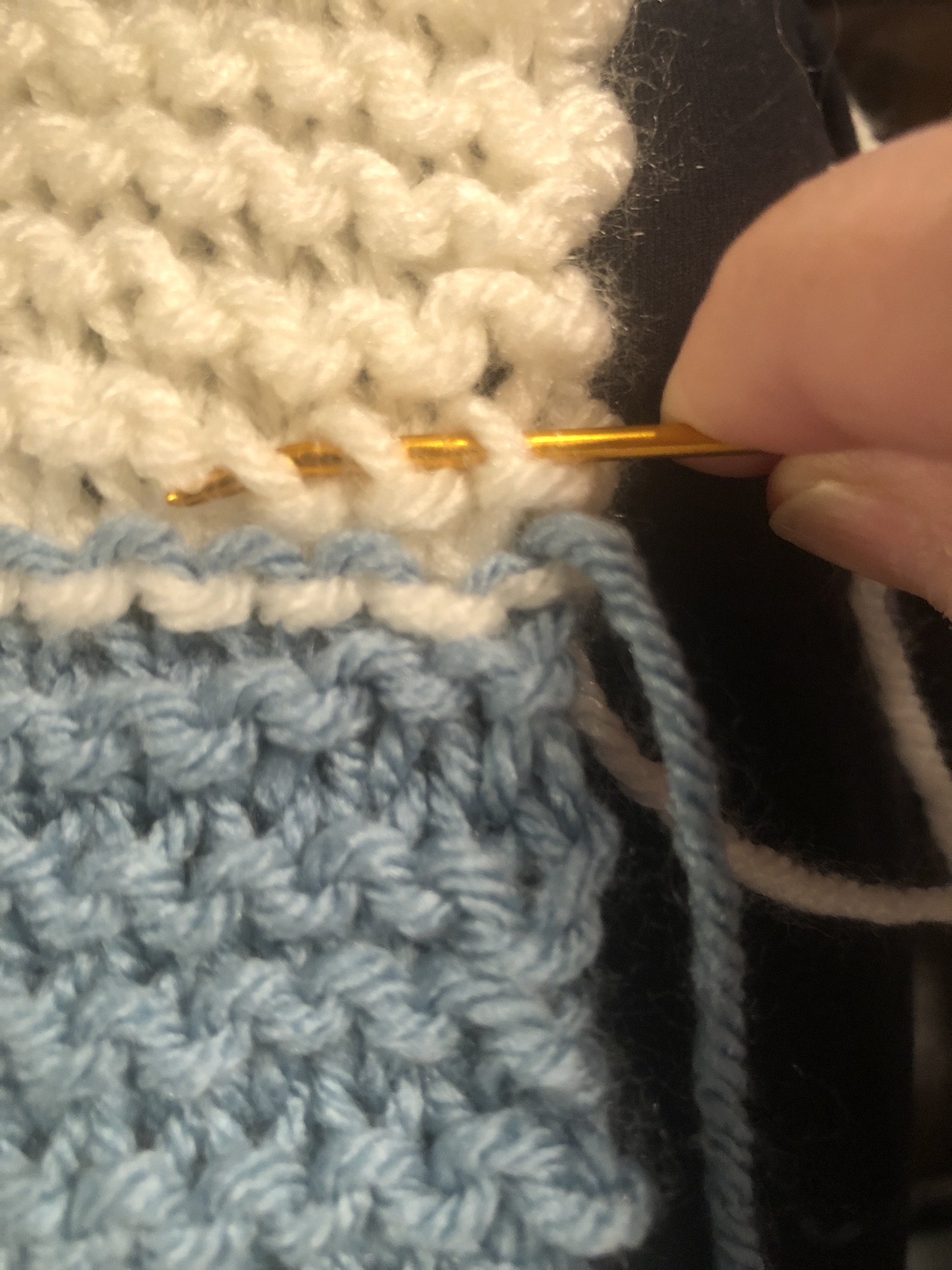 I’m calling the blanket The Siesta Key Beach Baby Blanket because the colors remind me of the beautiful sand and sea there. We call it paradise! Right now I am up north and it’s dreary and raining. I’d love to be down by the beach but the traveling part of that equation doesn’t work right now.