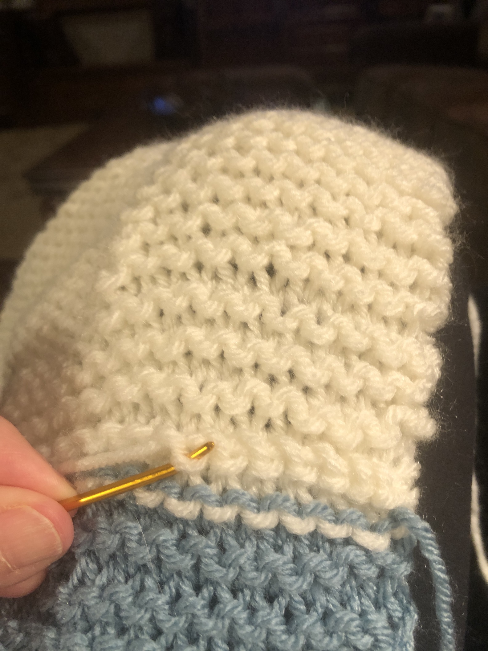 But for now I’d like to talk about the blanket that I just finished and the little hat that I am making to go along with it.