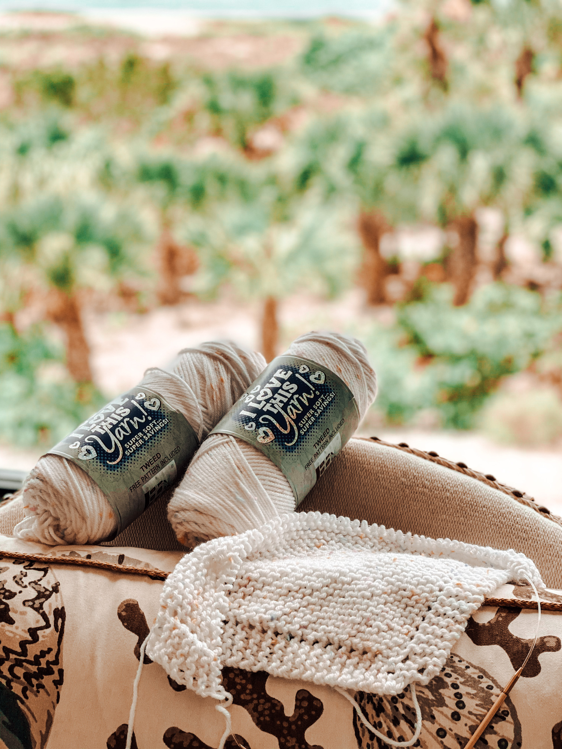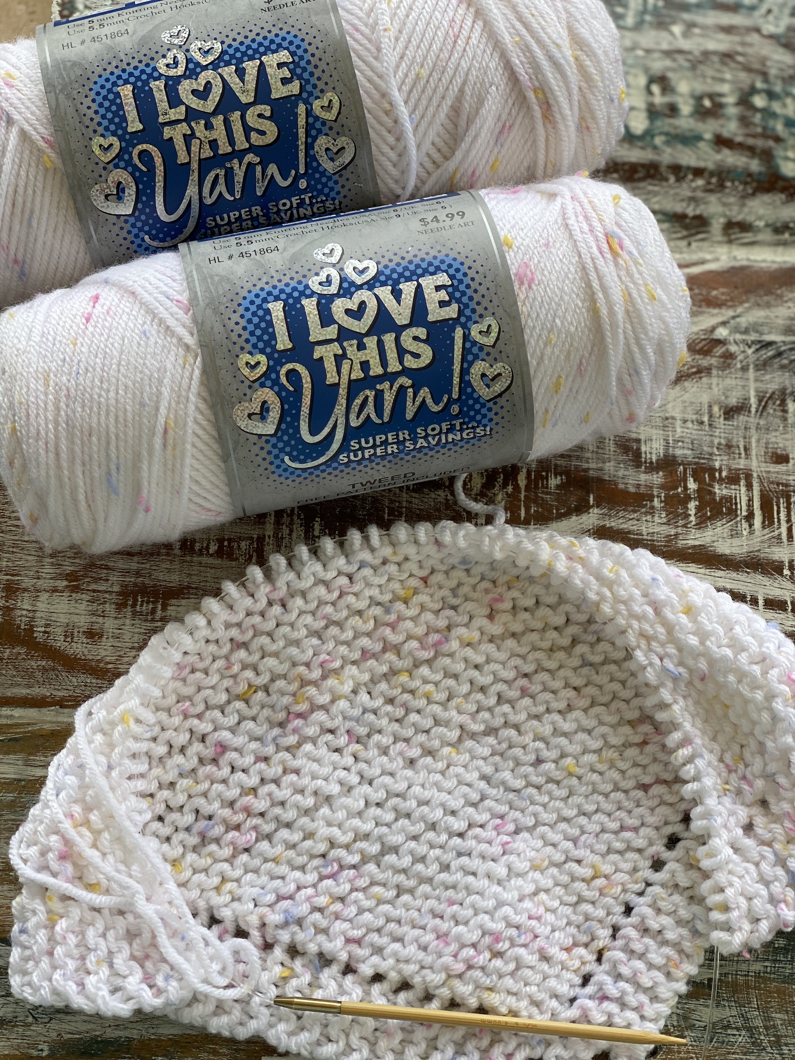 Project shown with 500 yards of Hobby Lobby’s Aran Weight I Love This yarn in Tweed: Colorway Pastels