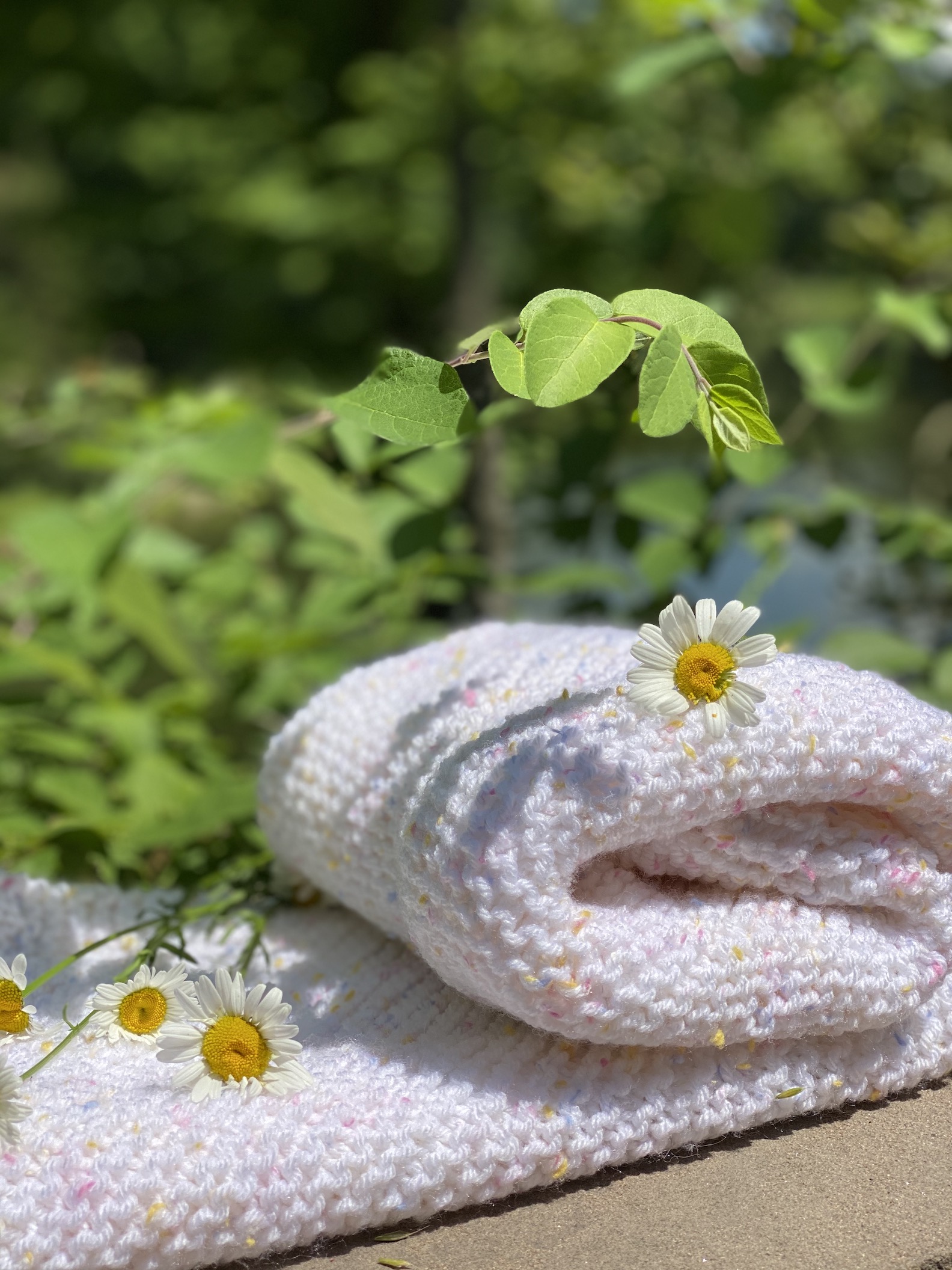 This pattern makes a perfectly square and reversible blanket. This Crosswise Baby Blanket is 24″ x 24″.