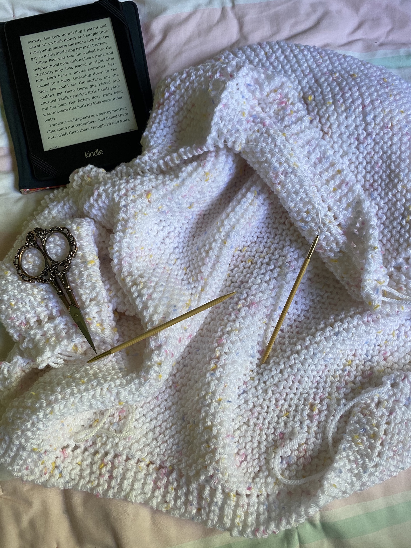 Can you read and knit at the same time? Started another Crosswise – just because it is the simplest, most mindless knitting project that I can knit with my eyes closed… or else reading a book.